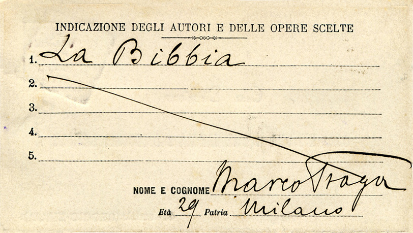 Ma ancora più curiose ed interessanti sono le singole schede che ci rivelano le predilezioni personali di intellettuali, scrittori, scienziati e uomini politici e che sono state ora ritrovate nell’archivio della scrittrice reggiana Virginia Guicciardi Fiastri, moglie di Giuseppe Guicciardi, coautore dell’inchiesta e futuro direttore del San Lazzaro. Tra le più significative: quelle di Carducci, che elenca i cinque autori da lui prediletti (Dante, Petrarca, Orazio, Tacito e Machiavelli); di Filippo Turati, che ripete per cinque volte: “Karl Marx, Das kapital”; di Anna Kuliscioff (Marx, Bebel, Engels, Herzen); di Marco Praga, che sceglie la sola Bibbia; di Cesare Lombroso che, oltre a Dante, Darwin e Goethe, sceglie un manuale di conversazione e un dizionario di sanscrito.