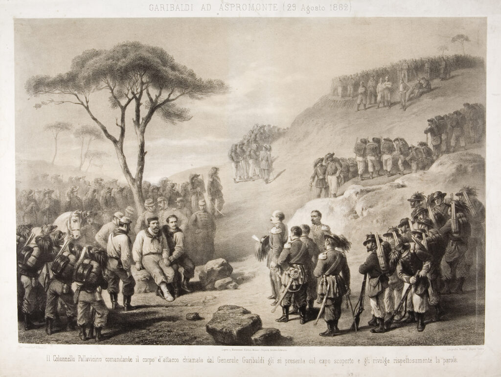 Garibaldi ad Aspromonte (29 Agosto 1862). Il Colonnello Pallavicino comandante il corpo d’attacco chiamato dal Generale Garibaldi gli si presenta col capo scoperto e gli rivolge rispettosamente la parola