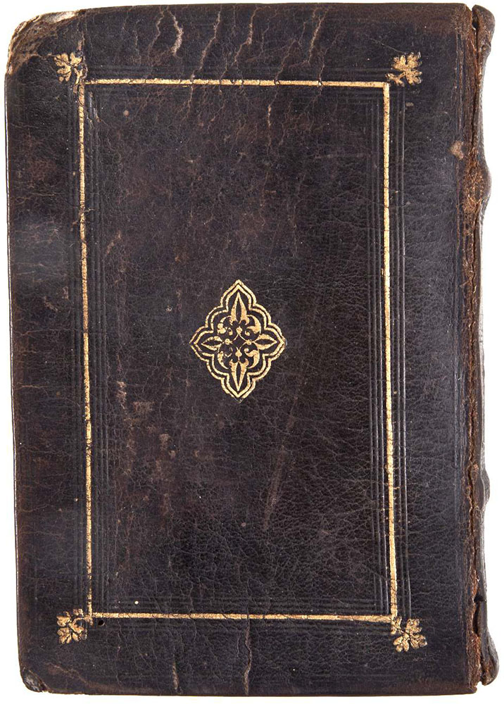 Cuoio di bazzana su cartone decorato a secco e in oro. Cornici caratterizzate da filetti bruniti, munite di rosette, fogliami a colpo di vento e palmette. Un motivo fitomorfo pieno negli angoli dello specchio. Fregio mamelucco centrale. Tracce di quattro lacci in seta verde. Cucitura su tre nervi. Tagli dorati e incisi. Stato di conservazione: mediocre. Parziale perdita di sostanza ai piatti e lungo il dorso. Diffuse spellature. Cerniere indebolite. Angoli ricurvi e sbrecciati.