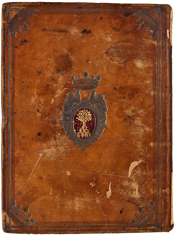 Corso, Rinaldo. Salmi in terza rima. 1566-1567. Roma. Cart.; 200 x 133 mm; c. I-XII + 96 c. + c. XIII-XVI; autogr.Cuoio di capra marrone su cartone decorato a secco e in oro. Filetti concentrici. Testine classiche, melograni, grottesche e cerchielli accantonati nel riquadro interno. Armi del cardinale Celio Piccolomini. Tracce di due coppie di lacci. Cucitura su quattro nervi. Stato di conservazione: discreto. Marginali Spellature e bruniture ai piatti. Le testine classiche1 e la data di redazione consentono di assegnare le legature al terzo quarto del secolo XVII, verosimilmente eseguite a Roma. Armi riferibili a Celio Piccolomini2, nato a Siena nel 1609, creato Cardinale da Alessandro VII il 14 gennaio 1664, scomparso il 24 maggio 1681.