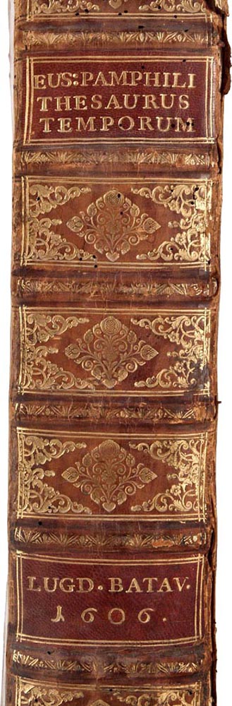Cuoio di vitello su cartone decorato in oro. Cornice caratterizzata dal decoro a dente di topo. Fregi fitomorfi lungo il margine interno dello specchio. Supra libros al centro del piatto. In testa e al piede del dorso il tassello in cuoio rosso recita “EUS: PAMPHILI / THESAURUS / TEMPORUM” e “LUGD. BATAV.1606.”; fiorone centrale su base quadrata entro fregi fitomorfi a mensola in quelli residui. Cucitura su sei nervi. Tagli colorati in rosso. Stato di conservazione: mediocre. Materiale di copertura parzialmente scomparso in testa al dorso. Cerniere fortemente indebolite. Alcune bruniture.