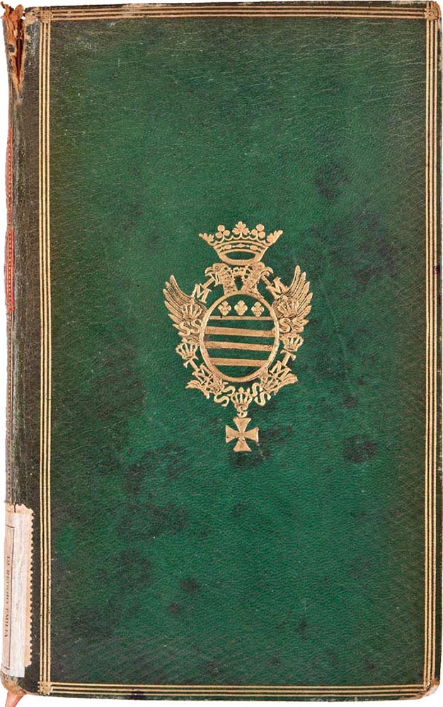 Cuoio marmorizzato nocciola su cartone decorato in oro. Cornice costituita da un filetto. Armi caratterizzate da quattro campi provvisti di una coppia di leoni rampanti e di bisce coronate ingollanti il bambino con scudetto centrale connotato dal toro rampante; sovrastante corona marchionale cimata. Cucitura su cinque nervi. Tagli colorati in rosso. Stato di conservazione: mediocre – discreto. Cuoio parzialmente scomparso. Cerniere indebolite. Angoli ricurvi.